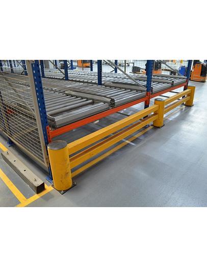 FIFO gravity-fed live racking module, 16.5m x 4.5m, 2800 to 3100mm high Metal pallet racking Description: FIFO gravity-fed live racking. Complete block for 4 rows of pallets. Dimensions: -Number of rails with rollers: 4 units measuring 800x16,500mm (bottom) + 4 units measuring 800x16,500mm (top) + -Includes side guardrails at 16 meters. Capacity: -Pallet weight: 250kg Currently disassembled and stored at our facilities.